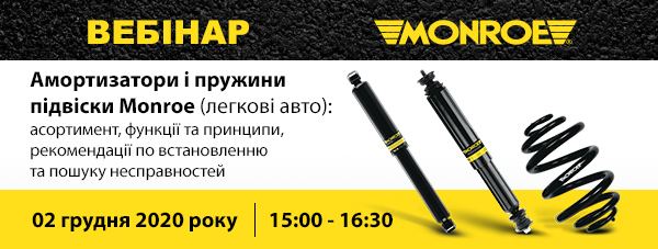 02 грудня 2020 року о 15:00 відбудеться вебінар на тему: "Амортизатори і пружини підвіски Monroe". Будуть розглянуті такі питання: