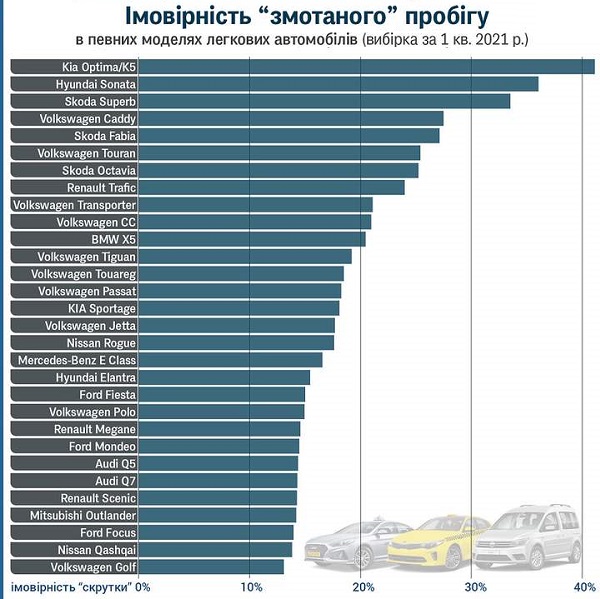 На діаграмі нижче біля кожної окремої моделі наведені частки пропозицій з виявленими “скрутками” у відношенні до загального обсягу пропозиції. Тобто, наприклад, якщо біля якоїсь певної моделі вказано значення 33%, це значить, що близько третини таких авто, запропонованих до продажу, можуть мати змінені показники лічильника пробігу.
