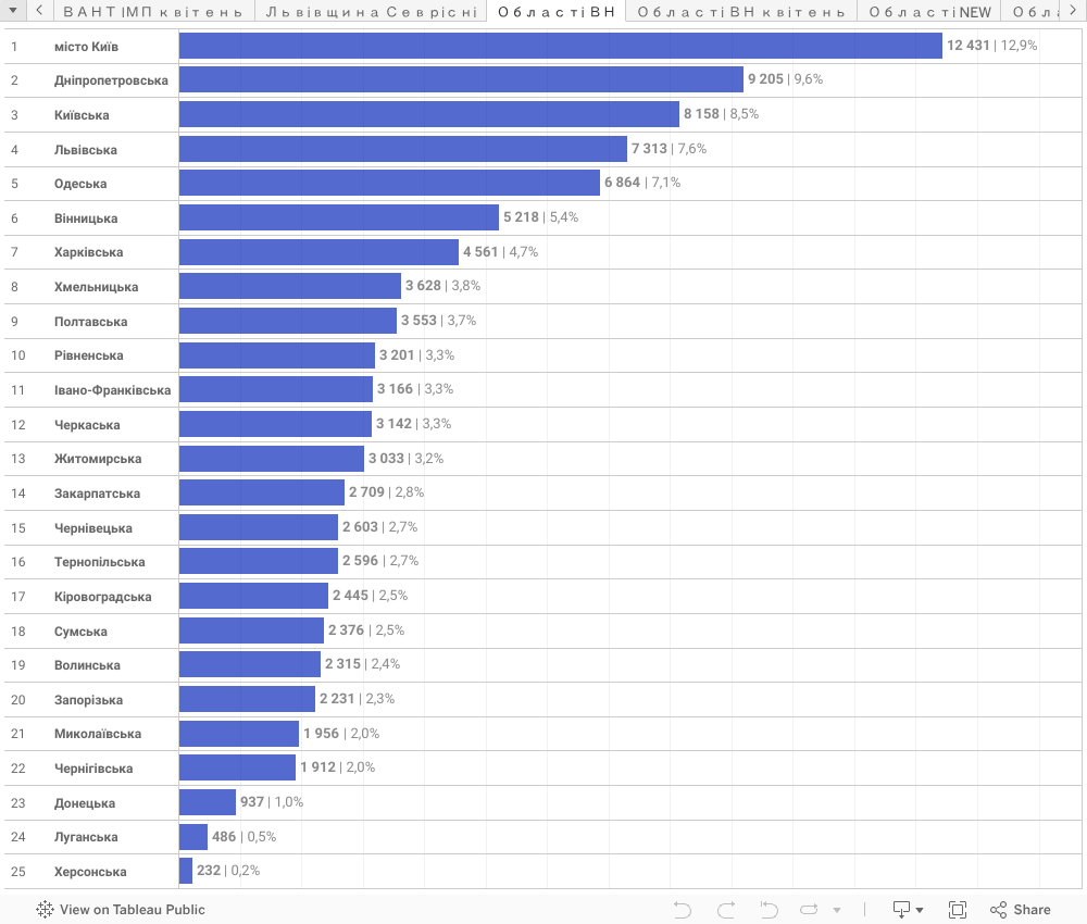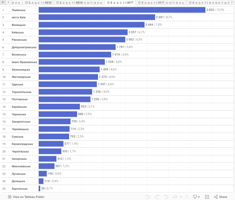 Також до найактивніших регіонів в березні увійшли Рівненська (1,1 тис.) та Київська (1 тис.) області. При цьому Київ разом із Київщиною складають більшість на ринку: 15,1%.
