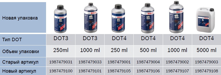 С июля 2014 года на украинском рынке доступны тормозные жидкости Bosch DOT-3 и DOT-4 в новой упаковке. Новая пластиковая тара идёт взамен прежней жестяной. Для DOT-3 объём упаковки может составлять 250 и 1000 мл, а для DOT-4 - 250, 500, 1000 и 5000 мл.