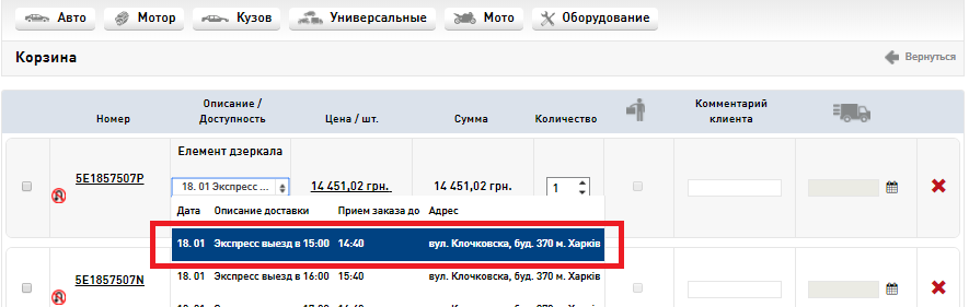 2. Изменена сортировка комбо-боксов выбора доставки в корзине. Теперь по умолчанию выбрана первая возможная доставка, т.е. если Вы не сделали осознанного выбора варианта доставки при отправке корзины, то заказ будет отправлен Вам с первой возможной доставкой.