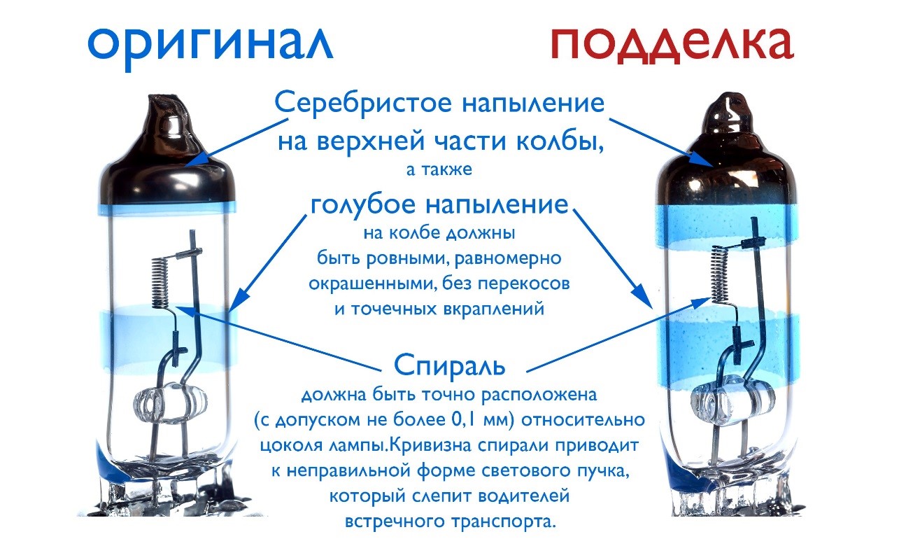 Помимо упаковки, аутентичная галогенная лампа имеет ряд уникальных конструктивных отличий.