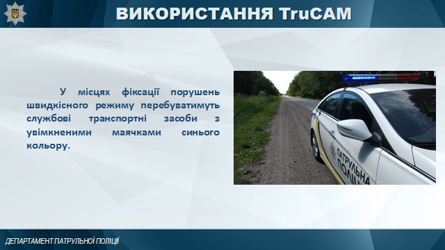 Патрульна поліція буде використовувати TruCam виключно на ділянках автодоріг із дорожніми знаками, що повідомляють про фото- відео фіксування порушень, з підвищеним рівнем аварійності, пов’язаним з перевищенням швидкості, як у містах так і на дорогах міжнародного значення.