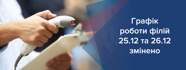 У п'ятницю, 25.12, та суботу, 26.12, всі філії працюватимуть до 15:00.