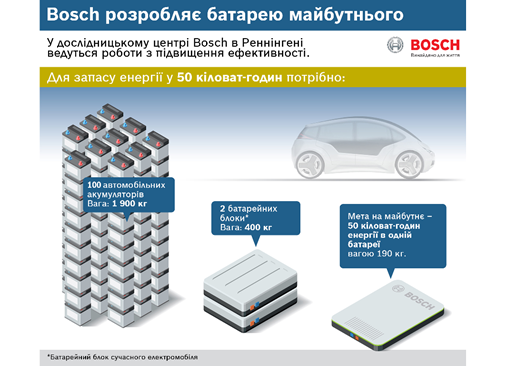 Д-р Торстен Охс та його команда цілком впевнені, що розвиток літій-іонних технологій дозволить досягти цієї мети. «Хоча в цій області потрібно зробити ще чимало», – говорить дослідник. Щоб досягти результатів, його команда у Реннінгені активно співпрацює з експертами Bosch в Шанхаї та Пало-Альто. Для розширення досліджень у сфері літій-іонних технологій компанія Bosch створила Lithium Energy and Power GmbH & Co. – спільне підприємство, співзасновниками якого також є GS Yuasa та Mitsubishi Corporation.