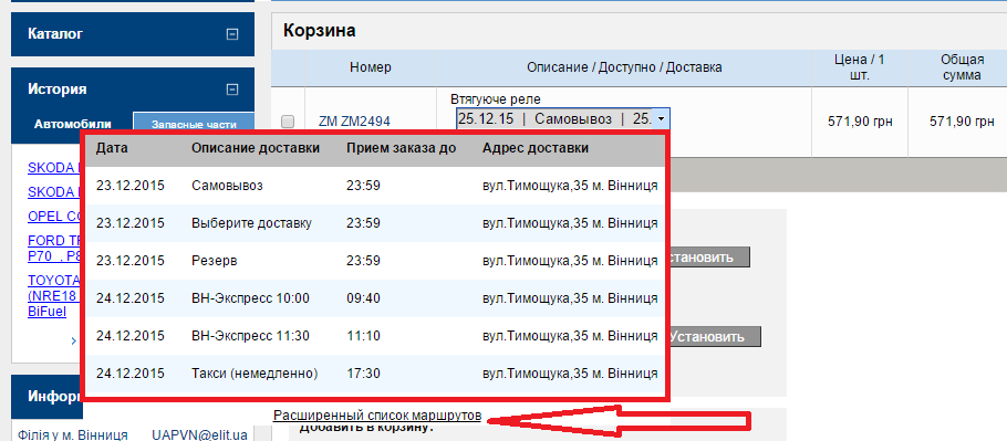 Когда вы выбираете удобный вам вариант доставки, вам не выпадают всё огромное количество вариантов как раньше. Теперь на экране отображается короткий список: ближайшая срочная доставка, ближайшая плановая доставка, ближайшая экспресс-доставка на завтра, самовывоз и резерв. На картинке также видно, что для винницких клиентов доступна доставка с помощью такси.