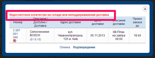 После нажатия кнопки «Отправить» и если выбрана доставка для склада, на котором товара нет в наличии, то выводится предупреждение: