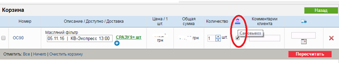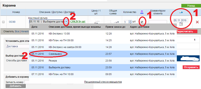 «Самовывоз» и «Дата самовывоза». Ставим галочку и выбираем дату самовывоза.
