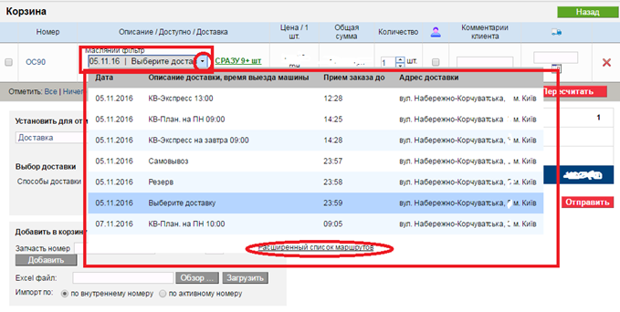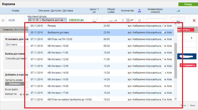 Для этого в корзине, в выпадающем списке, доступны оставшиеся доставки на сегодня и на следующие два дня (необходимо