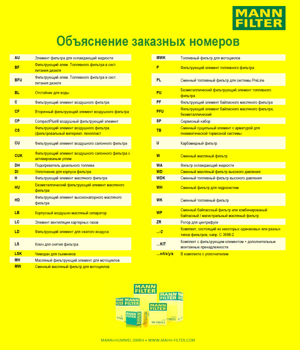 Чтобы не запутаться в выборе фильтров и выбрать именно то, что вам нужно, мы предлагаем вам ознакомиться с кодировкой фильтров торговой марки MANN+HUMMEL.