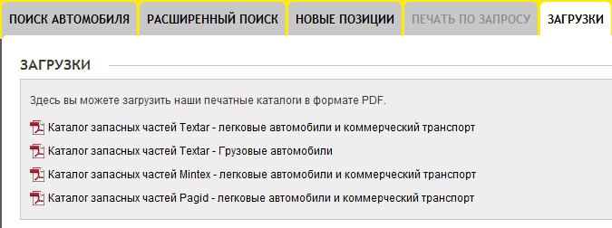 Здесь же доступны расширенный поиск по различным параметрам и обзор новинок Textar (см. вкладки в верхнем меню).