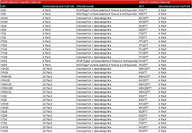 С мая 2017 года и далее компания Denso будет осуществлять автоматическую замену снятых с производства свечей зажигания линеек Iridium Power и Iridium Tough новыми свечами Iridium TT. По мере исчерпания складского запаса старых свечей зажигания, "ЭЛИТ-Украина" будет получать новые свечи IrTT. Ниже представлен обзор соответствующих наименований.