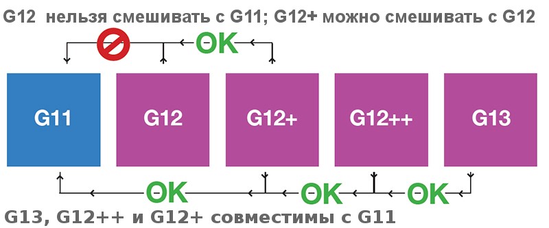 Существует стандартная классификация, предложенная компанией Volkswagen, которая говорит, что современные антифризы делятся на: неорганические «G11» (синий и зеленый) и органические «G12» (красный), которые несовместимы между собой. Также существует класс «G12+», который совместим со всеми стандартами. Важно помнить о том, что классификация Volkswagen не является стандартом, и производители охлаждающих жидкостей имеют право ее не придерживаться. Поэтому, при выборе антифриза, необходимо обращать внимание на маркировку, а не на цвет жидкости. Вы, к примеру, вполне можете приобрести органическую охлаждающую жидкость класса «G12» синего цвета.