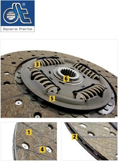 Особенностью ведомого диска сцепления, бренда DT Spare Parts, является оптимизированная упругость накладки, которая, в зависимости от области применения, обеспечивает бесперебойное увеличение крутящего момента при трогании автомобиля с места, а также эргономичное распределение нагрузки на педаль. Используемые фрикционные накладки состоят из нити, медной и латунной проволоки, заключенных в смесь из смолы, каучука и наполнителей. Они отличаются незначительным весом и высокой нагрузочной способностью. Накладки выдерживают кратковременное воздействие температуры до 400°C.
