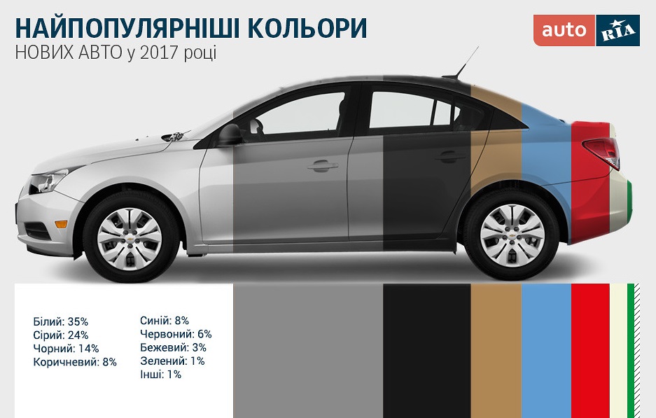 Чорній «масті» надали перевагу 14% покупців нових транспортних засобів. І дивно, оскільки влітку на стоянці така машина перетворюється в духовку, автомийники намагаються сховатися, якщо така машина заїжджає до них, а якщо покриття ще й типу «металік» чи «перламутр» - тоді домогтися абсолютної чистоти кузова можна хіба поставивши машину в герметичному боксі з антибактеріальними фільтрами для вхідного повітря. У меншості коричневий колір: таких машин лише 8%, а також синій (8%), червоний (який чудово пасує пожежним машинам і Ferrari), та бежевий (3%). Веселий зелений колір припав до душі лише 1% покупців, - це стільки ж, як і машин будь-якого іншого «немасового» кольору.