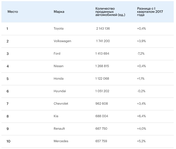 Самые популярные автомобильные марки в мире в первом квартале 2018-го