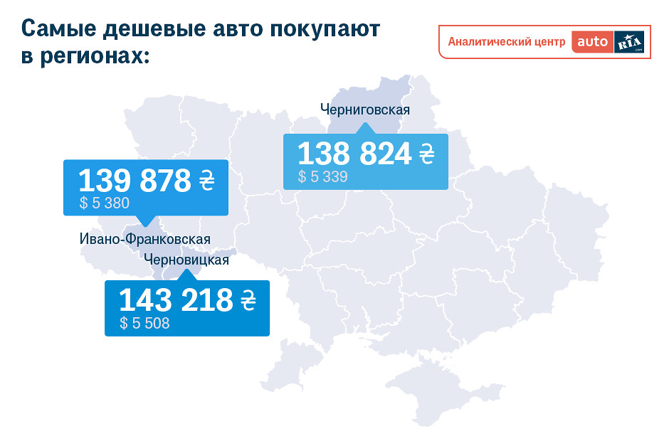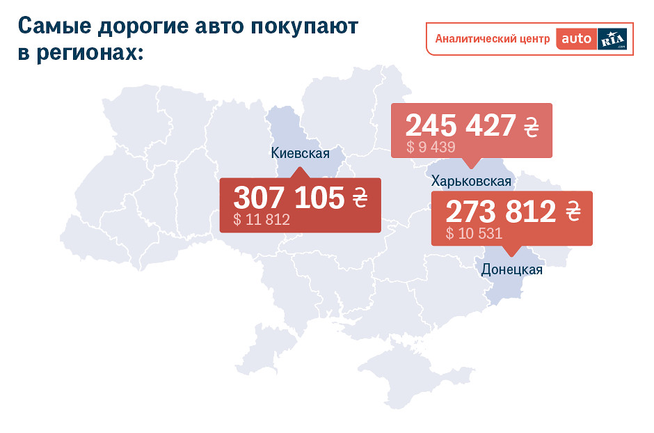 Примечательно, что в то время, как Харьков входит в пятерку самых активных городов авторынка, Харьковская область всего лишь замыкает ТОП-10 регионов. Донецкая и Луганская области ожидаемо расположились на последних местах таблицы, но вот в рейтинге самых дорогих автомобилей Донецк на лидирующих позициях. Если говорить о средней цене, то дешевые автомобили можно купить в западных регионах страны. Однако лидерство тут несколько неожиданно завоевал север Украины — средняя цена купленных в апреле автомобилей здесь составила 138 824 гривен или $5 339. Что же касается дороговизны, то тут предсказуемо в первых рядах промышленные регионы с городами-миллионниками: Харьковская область, уже упоминаемый Донецк и, конечно, столичный регион, где средняя цена достигла отметки в 307 105 грн ($11 812).