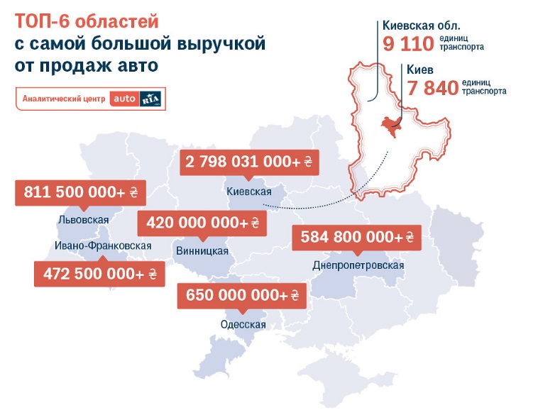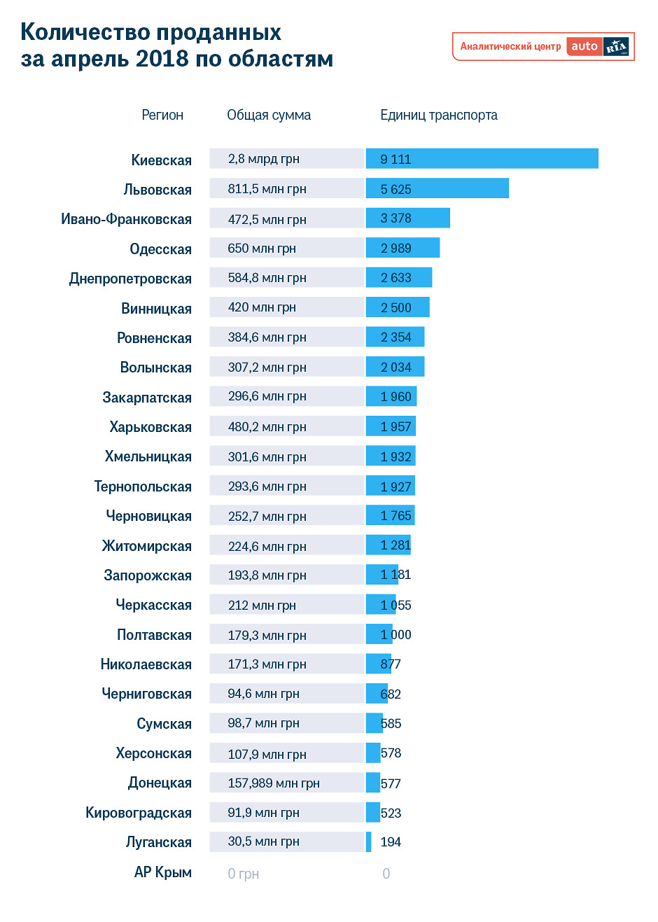 Другие регионы-лидеры продаж отстают от столицы минимум на 2 млрд грн. Самыми активными продавцами на AUTO.RIA в апреле оказались жители Львовской, Ивано-Франковской, Одесской, Днепропетровской и Винницкой областей. Вместе они продали авто на сумму 2,9 млрд грн.
