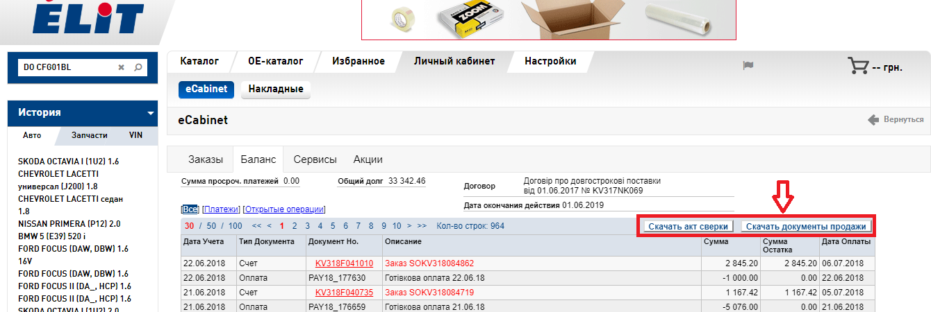 Эти функции доступны на вкладке «Баланс», в заголовке таблицы появились 2 кнопки – «Скачать акт сверки» и «Скачать документы продажи»