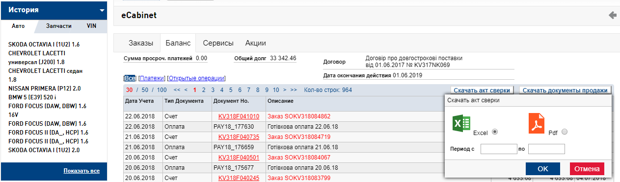 Для формирования и скачивания Акта сверки необходимо выбрать период и формат файла в котором Вы хотите получить Акт сверки, после этого нажать кнопку «Ок» после чего начнется загрузка файла…