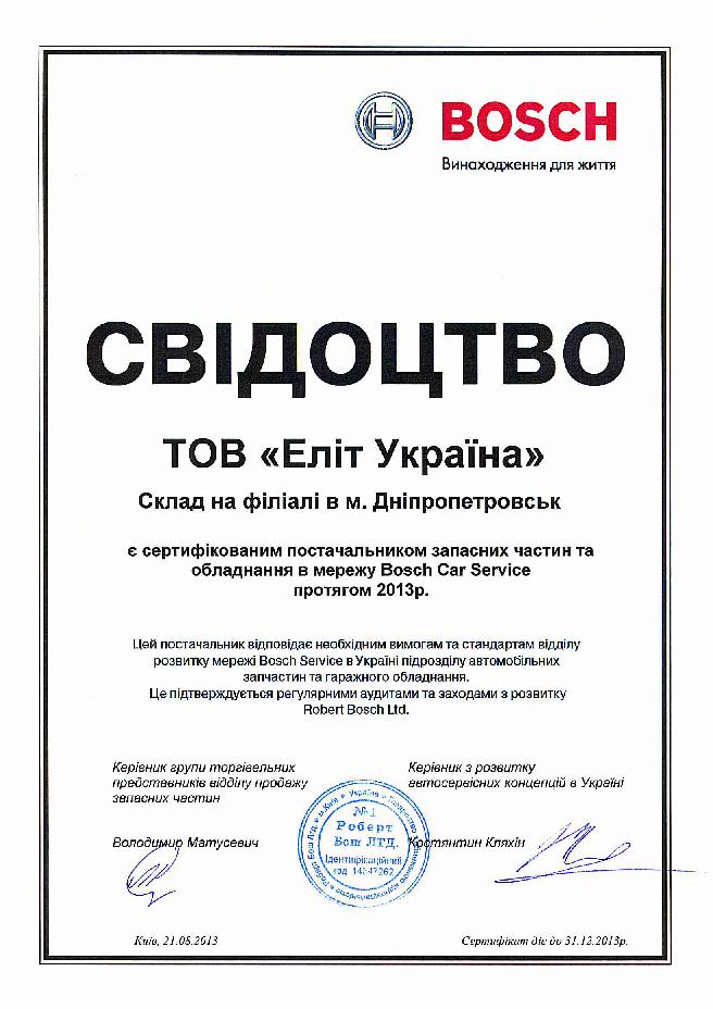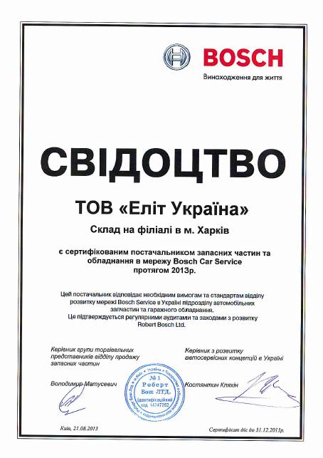 Еще два филиала компании «Элит-Украина» прошли сертификацию от поставщика Bosch. Напомним, что проверки проводятся на основании требований к поставщикам в 2013 году. Одно из главных требований - наличие запчастей Bosch для ТОР 100 наиболее распространенных автомобилей Украины.