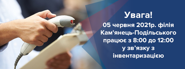 На філії в м. Кам'янець-Подільський командою ЕЛІТ-Україна у суботу 05 червня 2021 р. буде проводитись інвентаризація. Філія обслуговуватиме клієнтів до 12:00.