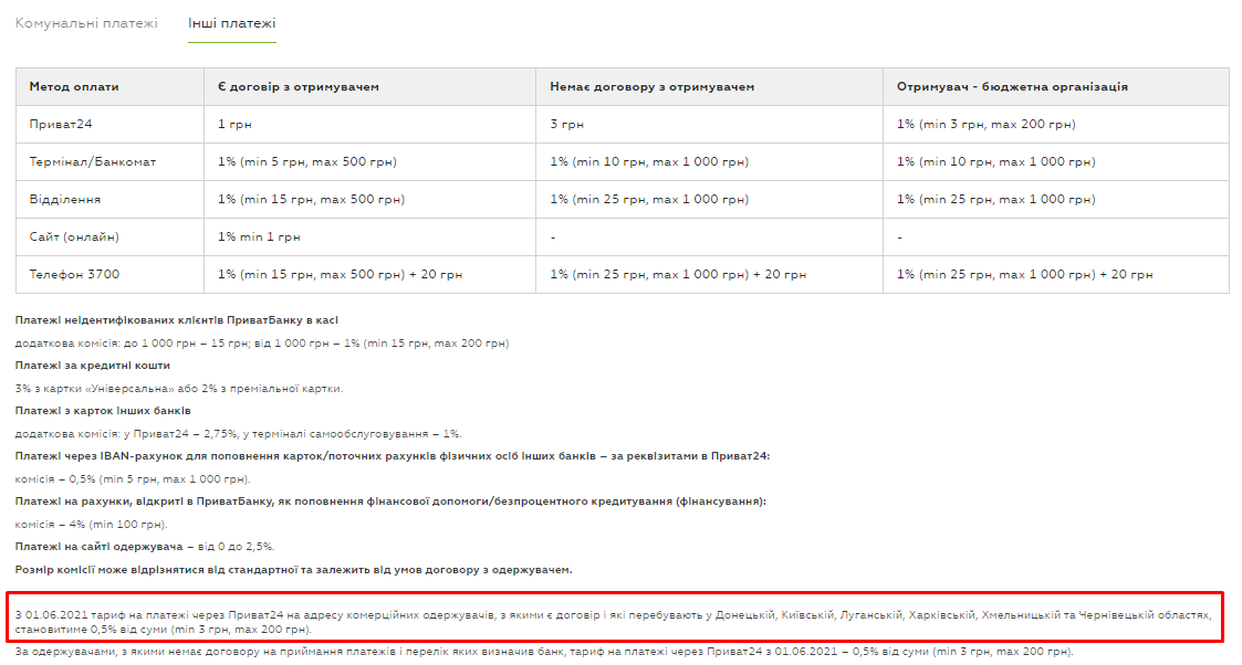 Інформуємо Вас про те, що з 03.06.2021 року Приват банк змінив тарифи на платежі через Приват24 і замість 1 грн. комісія становить 0,5% від суми (min 3 грн, max 200 грн).