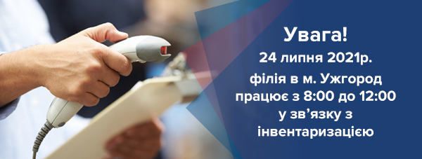 У суботу 24.07.2021 філія в м. Ужгород обслуговуватиме клієнтів до 12:00 у зв'язку з інвентаризацією.