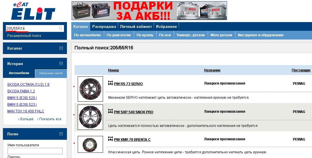 Подобрать необходимый комплект цепей очень просто. В строке поиска набираете размер шины в формате 205/55R16 (или 215/60R16 или 175/70R13) - и получаете в результатах поиска нужный продукт.