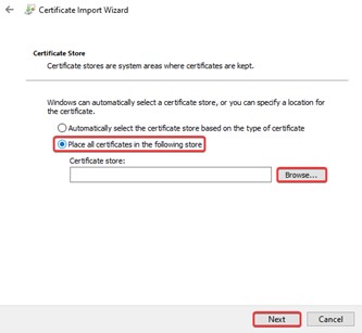 5. Виберіть пункт «Place all certificates in the following store» та натисніть «Browse»: