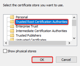 6. Виберіть сховище «Trusted Root Certification Authorities» і натисніть «OK»: