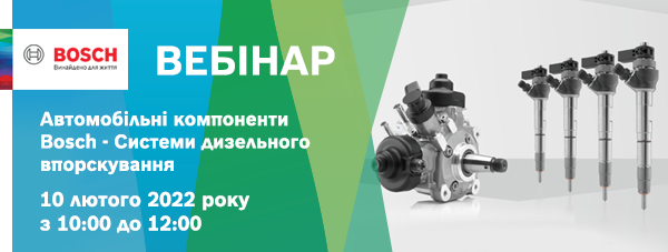 10 лютого 2022 року о 10:00 відбудеться вебінар на тему: "Автомобільні компоненти Bosch – Системи дизельного впорскування". Будуть розглянуті такі питання: