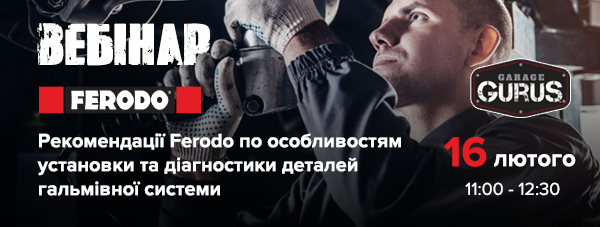 Доводимо до Вашого відома, що у п'ятницю, 16 лютого, об 11:00 буде проводитись вебінар на тему: "Рекомендації Ferodo по особливостям установки та діагностики деталей гальмівної системи".