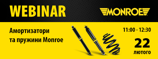 Запрошуємо Вас взяти участь у вебінарі на тему: "Амортизатори і пружини Monroe", який відбудеться 22 лютого 2023 року об 11:00.