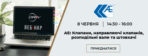 Запрошуємо Вас взяти участь у вебінарі на тему: "AE (клапани, направляючі клапанів, розподільні вали та штовхачі)", який відбудеться 8 червня 2023 року о 14:30.