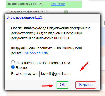 - Обрати потрібний сервіс для підключення. При виборі сервісу Вчасно треба вказати Email; отримувача з боку клієнта