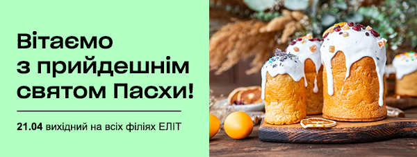 У зв'язку зі святом, у понеділок 21.04, вихідний на всіх філіях "ЕЛІТ-Україна".