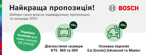 Спеціальна ціна зі знижкою 50% діє на діагностичні сканери Bosch KTS 560 або KTS 590 та 50% знижка на програмне забезпечення Esi Tronic Advanced або Master діє для Партнерів, які останні 12 міс не мали активної підписки Esi Tronic.