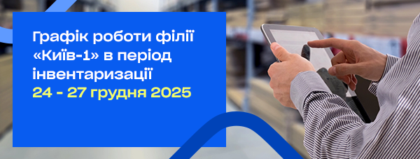 В період з 26 по 27 грудня включно, філія "Київ-1" буде зачинена на інвентаризацію. Протягом цього періоду можливо забрати своє замовлення самостійно на будь-якій іншій найбільш зручній для вас філії.