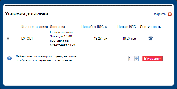 После нажатия на кнопку “В корзину” появится всплывающее окно с доступными ценами и поставщиками(в случае если их несколько):