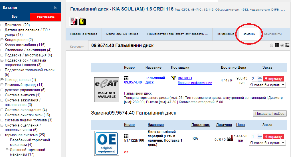 запчасть можно найти во вкладке “Замены”, в карточке товара: