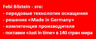 В качестве серьезного партнера оптовых предприятий и автомастерских Febi Bilstein уделяет большое внимание обеспечению качества и сервиса. И потому Febi Bilstein - это всегда продукты проверенного качества, соответствующего поставкам на конвейер. Компания «ЭЛИТ-Украина» рада предоставить своим клиентам запчасти Febi Bilstein. Ассортимент всех товарных групп уже на центральном складе и будет постоянно расширяться. Вы также можете заказывать запчасти Febi Bilstein со склада поставщика в Германии (уже скоро ищите эту возможность в eCat).