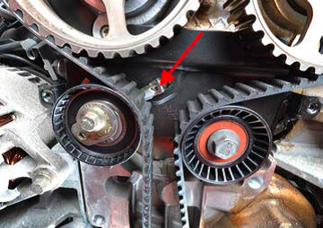 4. ослабте болт крепления натяжного ролика и снимите натяжение ремня ГРМ. Для этого поверните натяжное устройство шестигранной головкой по часовой стрелке;