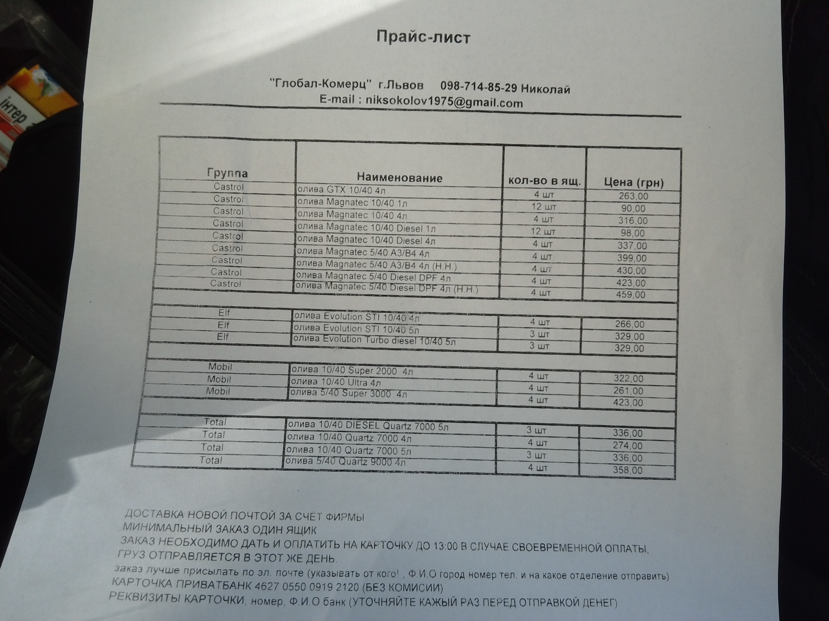 Ниже, Вы сможете посмотреть свежий прайс-лист компании, которая торгует поддельными моторными маслами. К сожалению, в каждом регионе есть аналогичный «оптовичёк». Мы ведем работу в юридическом поле, чтобы таких предприятий никогда не было.