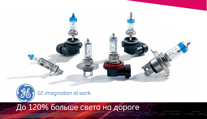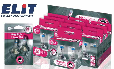 • Лампы GE Megalight Ultra обеспечивают до 120% больше света на дороге благодаря специальной конструкции нити накала и особенной методике напыления колбы.
