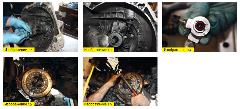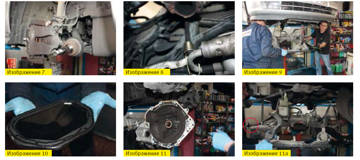 , так и нижнюю балку, для того чтобы отстегнуть полуось (см. изображение №7). В дополнение ко всему необходимо закрепить змеевики (охладители), так как их опора расположена на балке. Для этого надо подвесить ремешок через поперечину (см. изображение №8). Теперь балку можно снять, открутив 4 болта и придерживая телескопической стойкой, так как ее общая масса довольно большая (см. изображение №9). Также не забываем о кронштейне рычага переключения передач, который закреплен на балке. Перед демонтажем полуоси требуется слить масло из КПП. Так как именно у этого автомобиля нет крышки, необходимо открутить поддон картера и нанести тонкий слой клея-герметика перед установкой (см. изображение №10). Теперь можно достать полуось и легко отсоединить КПП (см. изображение №11), одновременно отстегнув патрубок гидравлической магистрали. В конце процесса надо отсоединить систему выхлопа, которую можно «подвесить» на проволоке, чтобы не отломать кронштейны глушителя (см. изображение №11). После демонтажа старого комплекта сцепления необходимо убедиться в нормальном состоянии рабочей поверхности маховика и, конечно, почистить внутренности корпуса КПП перед установкой нового подшипника (см. изображения №12 и 13). Оригинальный гидравлический выжимной подшипник может отличаться от конструкции выжимного подшипника LuK с артикульным номером 510 0073 10. В этом случае нужно удалить старое уплотнительное кольцо от предыдущей версии подшипника. Иначе из-за закупорки трубки старым сальником жидкость не будет возвращаться, и выжимной подшипник будет поврежден при прокачке (см. изображение №14). Именно по данной теме и был выпущен специальный бюллетень технической информации LuK 0018, а также инструкция по установке, которая находится в каждой коробке с выжимным подшипником.