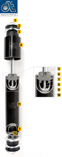 Высококачественное уплотнение поршневого штока с несколькими манжетами автоматически подстраивается к нормальному износу. Обширный ассортимент продукции DT Spare Parts предлагает наряду с амортизаторами моста полный ассортимент амортизаторов кабин и пневматических подвесок.