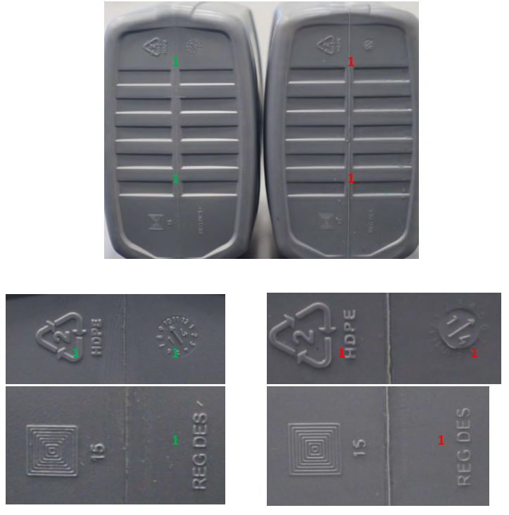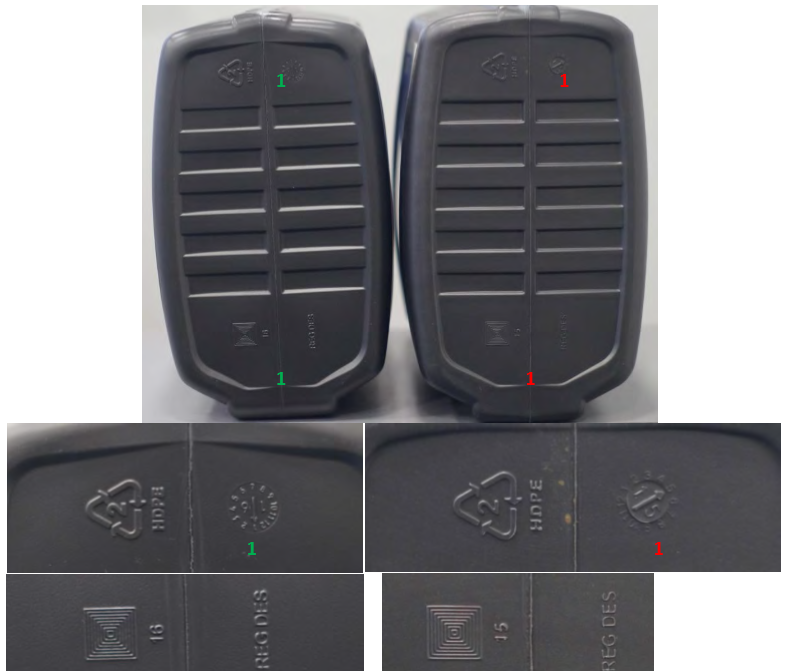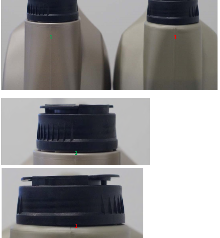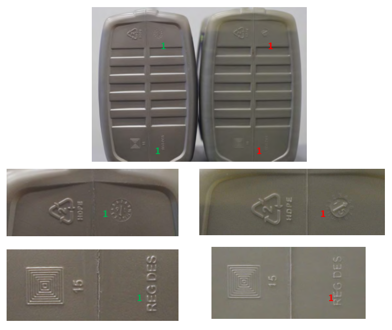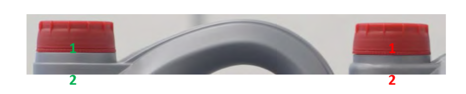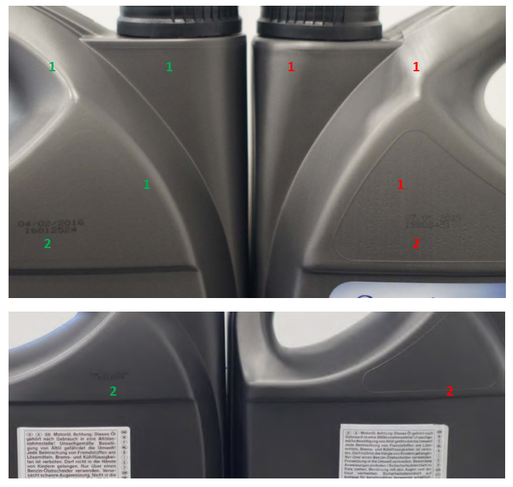 2) Еще раз обращаем Ваше внимание на то, что на оригинальной канистре треугольная отливка практически не видна, на поддельной четко выражена, также на оригинале дата и Batch номер на тыльной стороне канистры.