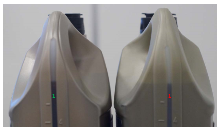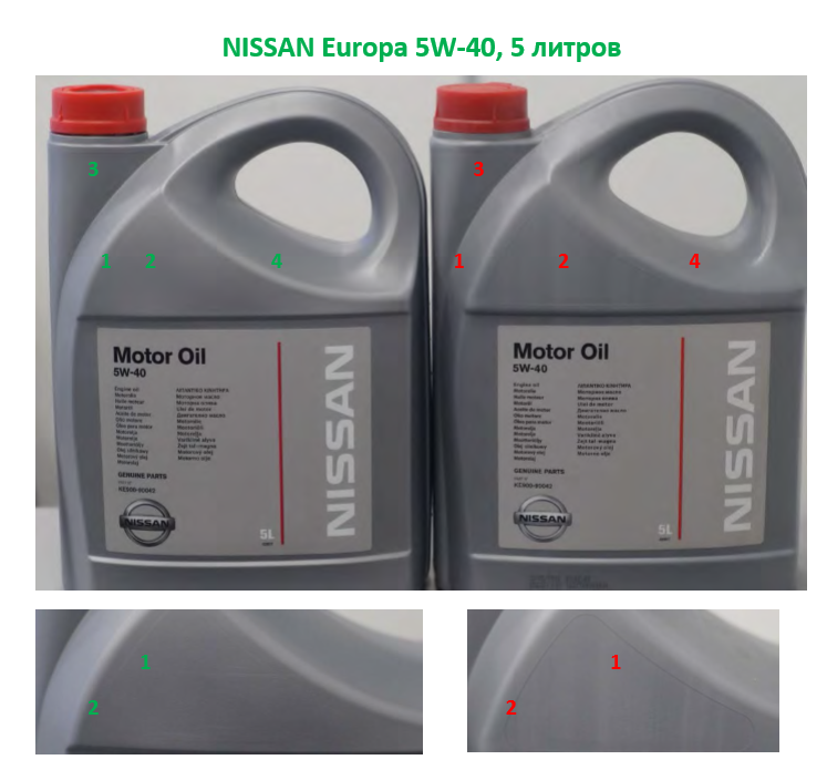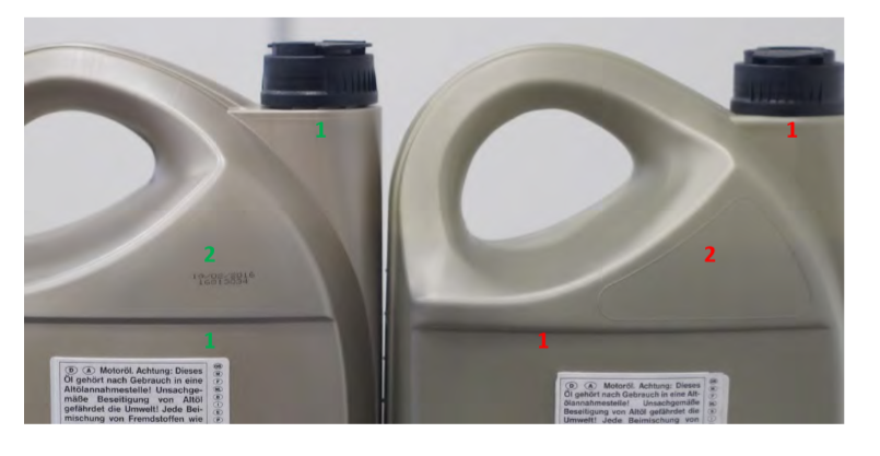 4) На оригинале практически не виден уровень масла в канистре, на подделке уровень "масла" четко просвечивается.