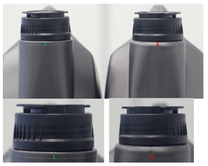 1) На оригинале крышка подогнана с небольшим равномерным зазором строго горизонтально к плоскости горлышка, но подделке крышка подогнана с перекосами либо в плотную к горлышку канистры.